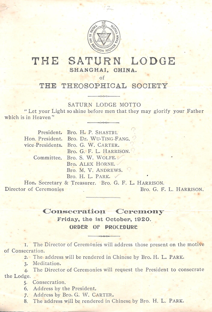 The first lodge in China was the Saturn Lodge in Shanghai chartered in 1920, with Mr. H. P. Shastri as President and Mr. G. F. L. Harrison as Secretary. This was apparently renamed as Shanghai Lodge, since it is so reported in the annual report of 1924. In 1922, Sun Lodge was chartered in Shanghai. The theosophical efforts in China were often pioneered by Westeners who were then living in various parts of China.